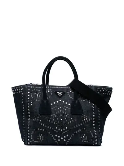 studded denim body rolled handles detachable strap open top double zip compartments interior zip and slip pockets blue Inclusions: authenticity card, shoulder strap. Condition: GOOD. This previously owned and used item is in good condition with minimal signs of use. This may include fading of material or plating and scratches. Please refer to the photos on this product page for a detailed view of the item, including any damages declared.