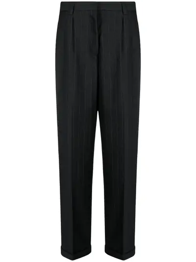 black virgin wool herringbone pattern pinstripe pattern embroidered logo to the rear mid-rise belt loops concealed front fastening two side slash pockets two rear welt pockets pressed crease turn-up cuffs wide leg