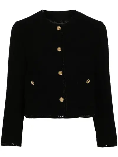 black wool blend tweed round neck sequin detailing shoulder pads long sleeves faux-buttoned cuffs two patch pockets locker loop internal logo tag full lining straight hem gold-tone buttons front button fastening