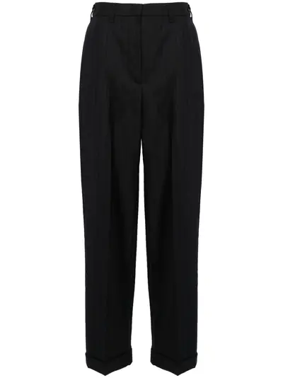 midnight blue/chocolate brown virgin wool pinstripe pattern herringbone pattern logo patches to the rear pleat detailing tailored cut high-waisted concealed front button and hook fastening belt loops two diagonal pockets to the sides two rear button-fastening jetted pockets pressed crease turn-up hem