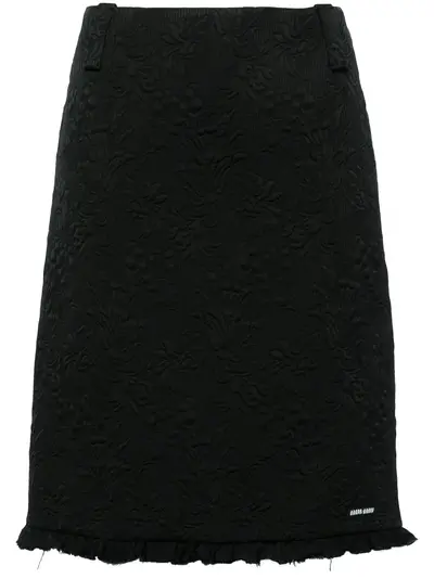 black wool blend floral matelassé effect logo patch to the side rear zip fastening pencil silhouette rear slit ruffle hem knee-length