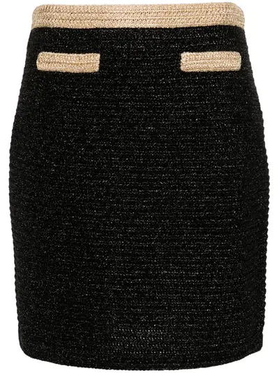 black/gold-tone knitted construction lamé effect concealed side zip fastening slim cut two front welt pockets straight hem thigh-length