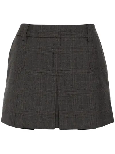 dark grey virgin wool Prince of Wales check pattern belt loops fully pleated two side slash pockets logo patch to the rear thigh-length straight hem concealed side hook and zip fastening