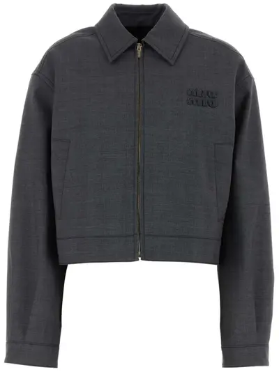 anthracite grey virgin wool Prince of Wales check pattern appliqué logo classic collar front zip fastening long sleeves two side welt pockets straight hem