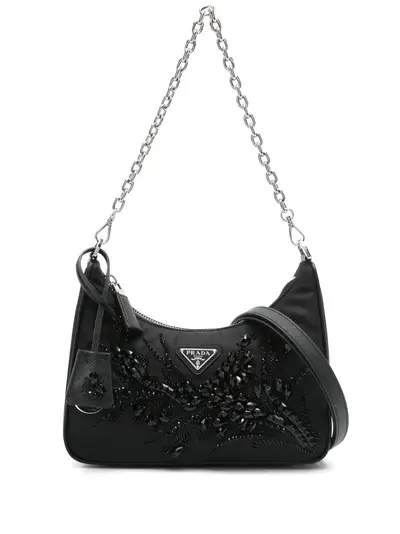 black ECONYL® top zip fastening detachable chain-link shoulder strap detachable shoulder strap enamel triangle logo crystal embellishment bead embellishment hanging key fob ring hardware detailing main compartment internal logo plaque jacquard logo motif This piece comes complete with a protective dust bag.