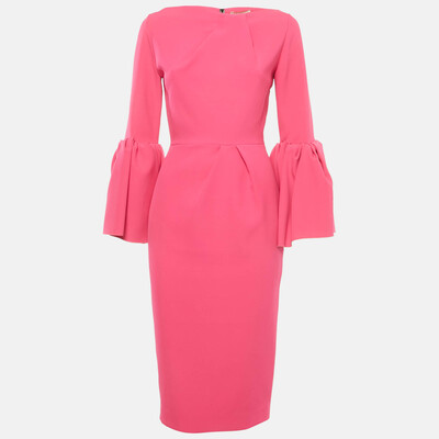 This Roksanda midi dress in pink stretch crepe balances femininity with sculptural design. The fitted bodice flows into flared bell sleeves and a clean, midi length hem. Minimal yet impactful, it’s a polished pick for events, work, or refined daytime edits.