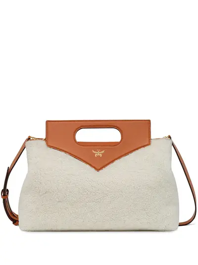 caramel brown/white calf leather/shearling magnetic fastening two top handles adjustable detachable shoulder strap gold-tone hardware logo stamp to the front main compartment suede lining internal patch pocket