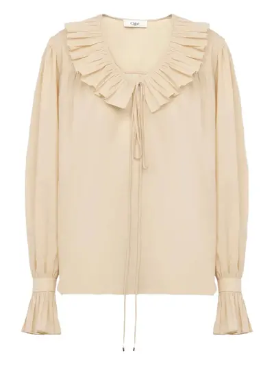 beige ruffled collar drawstring neckline long sleeves ruffled cuffs