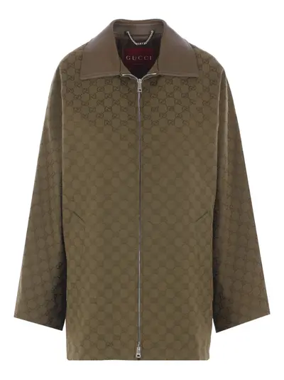 olive green GG monogram pattern zip front fastening leather collar long sleeves