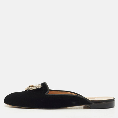 Indulge in pure sophistication with these exquisite black velvet slip on mules. Embellished with crystals, their elegance is apparent in every facet. Crafted by Oscar de la Renta, these flat mules combine luxurious velvet on the exterior with a premium leather lining, offering superior comfort.
