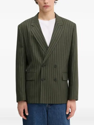 olive green pinstripe pattern double-breasted closure notched lapels long sleeves buttoned cuffs