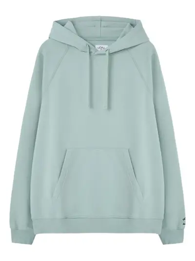 blue raglan sleeves hooded neckline kangaroo pocket embroidered logo ribbed cuffs