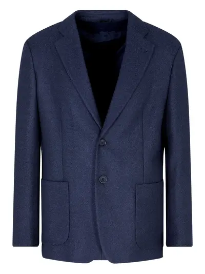 dark blue wool button fastening patch pockets notched lapel straight hem