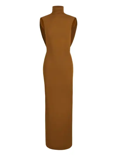 brown turtleneck neckline sleeveless low-cut back draped detailing