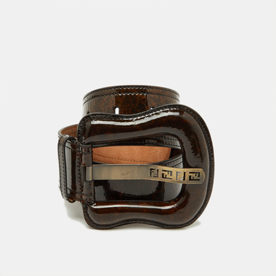 Fendi redefines the waist belt with this two tone iteration in brown patent leather. Glossy texture, a shapely buckle, and a logo cut pin lend visual impact to a piece that can cinch, anchor, or add punctuation to tailored ensembles.