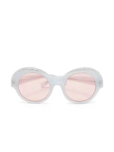 white pink lenses crystal embellishment round frame straight arms curved tips These glasses come with a protective case. Condition: GOOD. This previously owned and used item is in good condition with minimal signs of use. This may include fading of material or plating and scratches.