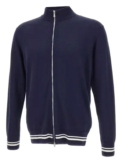 navy blue full two-way zip closure stand-up collar long sleeves ribbed cuffs striped hem