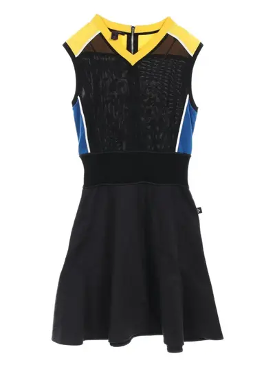 circa 2010s black nylon fabric yellow and blue panels mesh panel bodice V-neck design fitted waist Condition: EXCELLENT. This previously owned item is in near-perfect condition with no signs of damage or use.