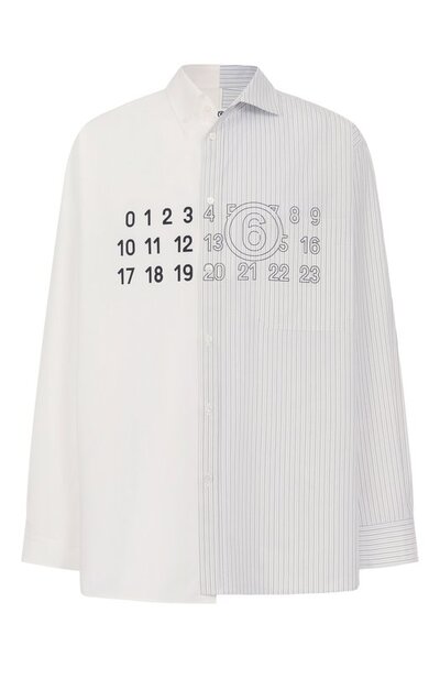 Асимметричную рубашку со спущенной линией плеч выполнили из хлопкового поплина: однотонного и в полоску. Спереди модель украсили фирменным числовым кодом.