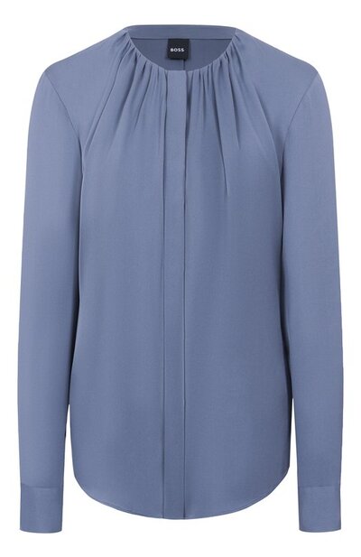 Блузу Banorah с супатной застежкой и прямоугольными манжетами выполнили из стрейчевого шелкового атласа. Круглую горловину модели украсили драпировкой.