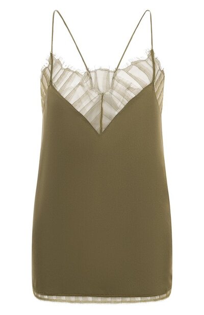 Для изготовления топа Berwyn в бельевом стиле использовали блестящий шелковый атлас. Модель с тонкими бретелями и глубоким вырезом отделали по краям плиссированной полупрозрачной оборкой.