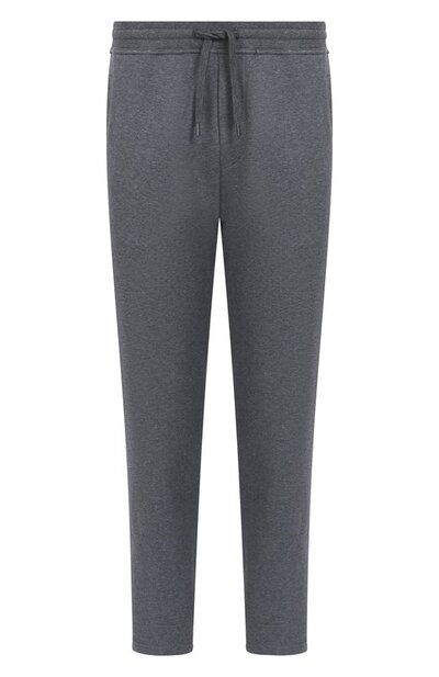 Брюки сшили из эластичного хлопкового трикотажа. Меланжевую модель с поясом-кулиской в рубчик дополнили боковыми и задними прорезными карманами.