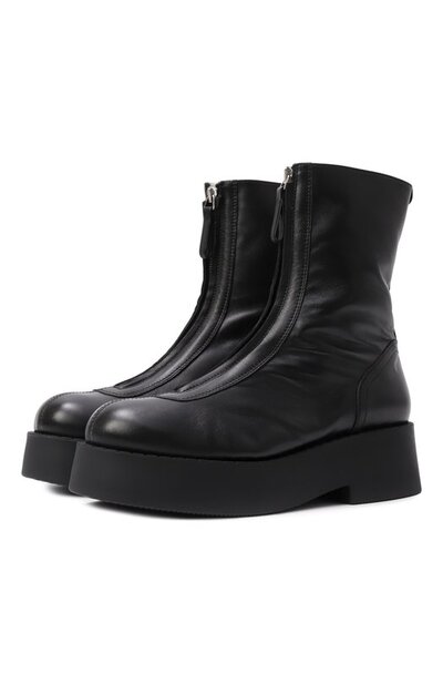 Ботинки с круглым мысом и широкой платформой сшиты из гладкой кожи. Голенище дополнено брендированной петлей. Модель, отделанная внутри контрастной овчиной, застегивается молнией спереди.