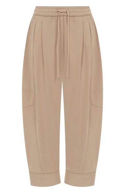 Свободные брюки с акцентными швами, двойными защипами и широкими манжетами выполнили из френч терри на основе органического хлопка. Укороченную модель с парой боковых карманов и двумя листочками сзади дополнили поясом-кулиской.
