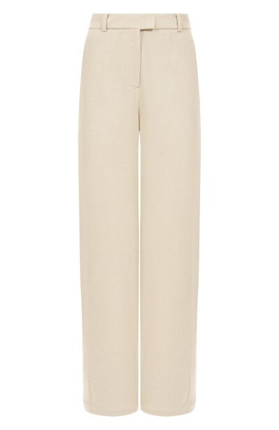Брюки прямого кроя сшили из вискозного пике Sparkling с добавлением хлопка и нитей ламе. Пояс со шлевками дополнили эластичной вставкой, а по бокам и сзади предусмотрели карманы с листочками.