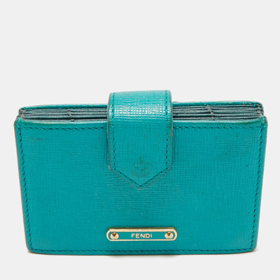 Made in textured Saffiano leather, this Fendi womens card holder in teal blue has accordion compartments lined with fabric. A functional essential with a pop of color.