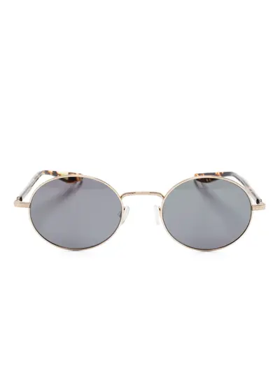 gold-tone round frame grey lenses engraved detailing These glasses come with a protective case.