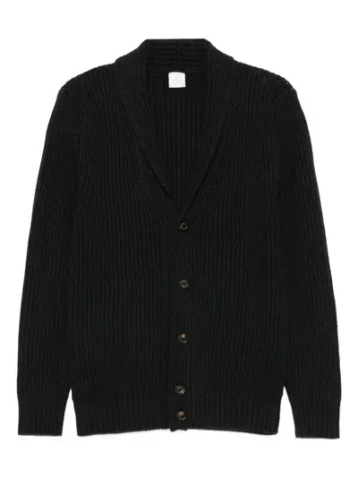 black wool shawl collar button front fastening long sleeves ribbed trim
