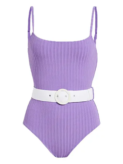 lilac ribbed texture adjustable straps scoop neck white belt round buckle Be mindful to try on swimwear over your own garments.