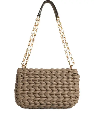 beige woven design magnetic button closure chain shoulder strap leather handle flap closure Please refer to the Size & Fit tab to learn more about this item's dimensions.
