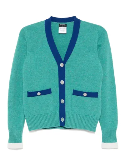 turquoise blue-green front button fastening ribbed V-neck long sleeves two front patch pockets ribbed cuffs and hem Condition: GOOD. This previously owned and used item is in good condition with minimal signs of use. This may include fading of material or plating and scratches.
