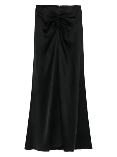 black maxi length gathered waistband straight hem fluid drape satin texture