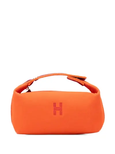 canvas body flat handle top zip closure interior slip pockets orange This item has no inclusions. Condition: EXCELLENT. This previously owned item is in near-perfect condition with no signs of damage or use. Due to the exclusivity of this item and its limited availability, processing and delivery might take longer than usual. Please refer to the photos on this product page for a detailed view of the item, including any damages declared.