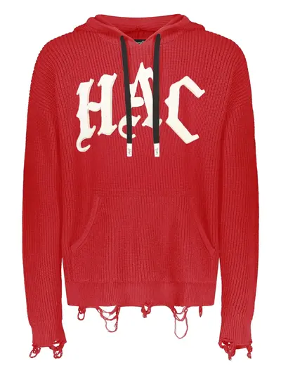 red wool frayed hem applique detail hooded neckline kangaroo pocket