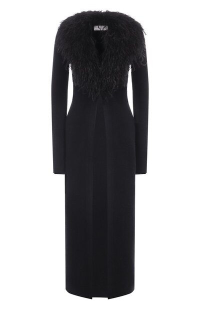 Удлиненный кардиган на пуговице связали из шерстяной пряжи. Глубокий V-образный вырез подчеркнули широким воротником из перьев в тон.