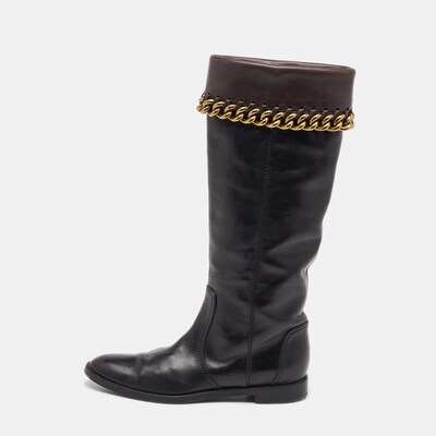 Sergio Rossi Black/Dark Brown Leather Chain Detail Calf Length Boots Size 35.5 1194798 (чёрный, lpn30761037)