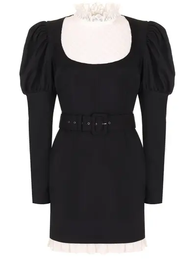 -Модель с акцентом кроя на талии и бедрах, длинными рукавами с объёмом в плечах, широким поясом с пряжкой, который подчеркивает талию и структурирует силуэт.