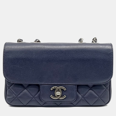 This Chanel chain bag in durable caviar leather features a classic flap closure and chain link strap. Practical in size and resilient in texture, it’s an easy everyday choice.