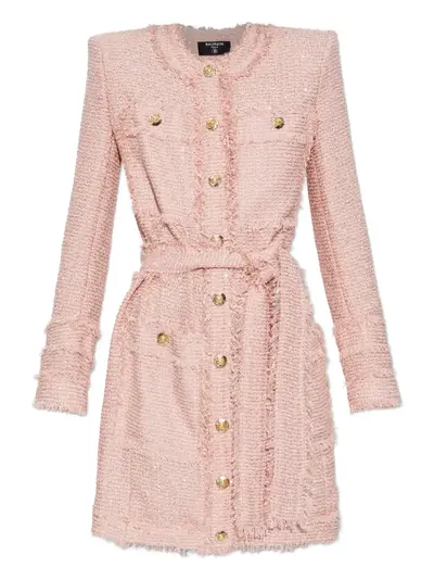 pink tweed texture sequin embellishment frayed edges gold-button detailing belted waist