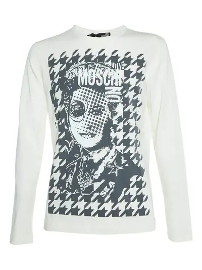 white cotton houndstooth print graphic print round neck long sleeves Condition: GOOD. This previously owned and used item is in good condition with minimal signs of use. This may include fading of material or plating and scratches.