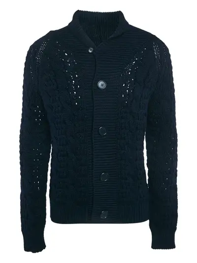 navy blue virgin wool cable knit openwork detailing front button fastening long sleeves Condition: GOOD. This previously owned and used item is in good condition with minimal signs of use. This may include fading of material or plating and scratches.