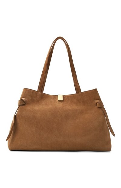 Сумка-тоут Gyoza с двумя удлиненными ручками и внутренним карманом сшита из замши. Аксессуар с декоративными узлами по бокам застегивается магнитной кнопкой с золотистой накладкой.
