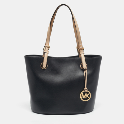 Designed for daily life, this Jet Set tote is cut from durable black leather with gold tone accents. It slips easily over the shoulder and handles whatever the day throws your way.