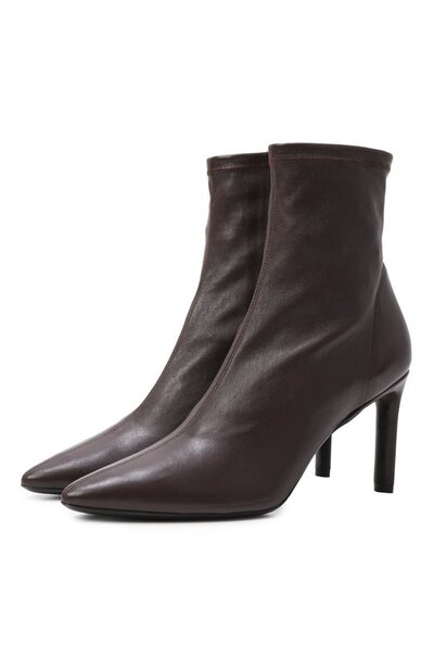 Ботильоны с зауженным мысом и короткой молнией сбоку выполнили из кожи ягненка оттенка Chocolate. Таким же материалом обтянули высокий прямой каблук.