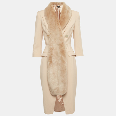 This pink coat by Elisabetta Franchi is tailored in crisp crepe and trimmed with a plush faux fur collar. The double breasted silhouette and feminine hue make it a standout layer for cooler seasons.