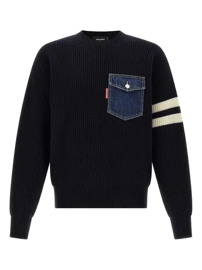 navy blue ribbed knit denim pocket crew neck long sleeves off-white stripes